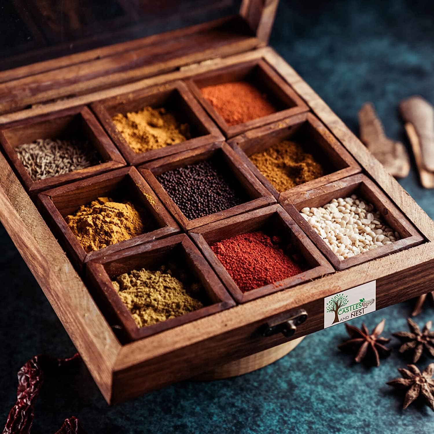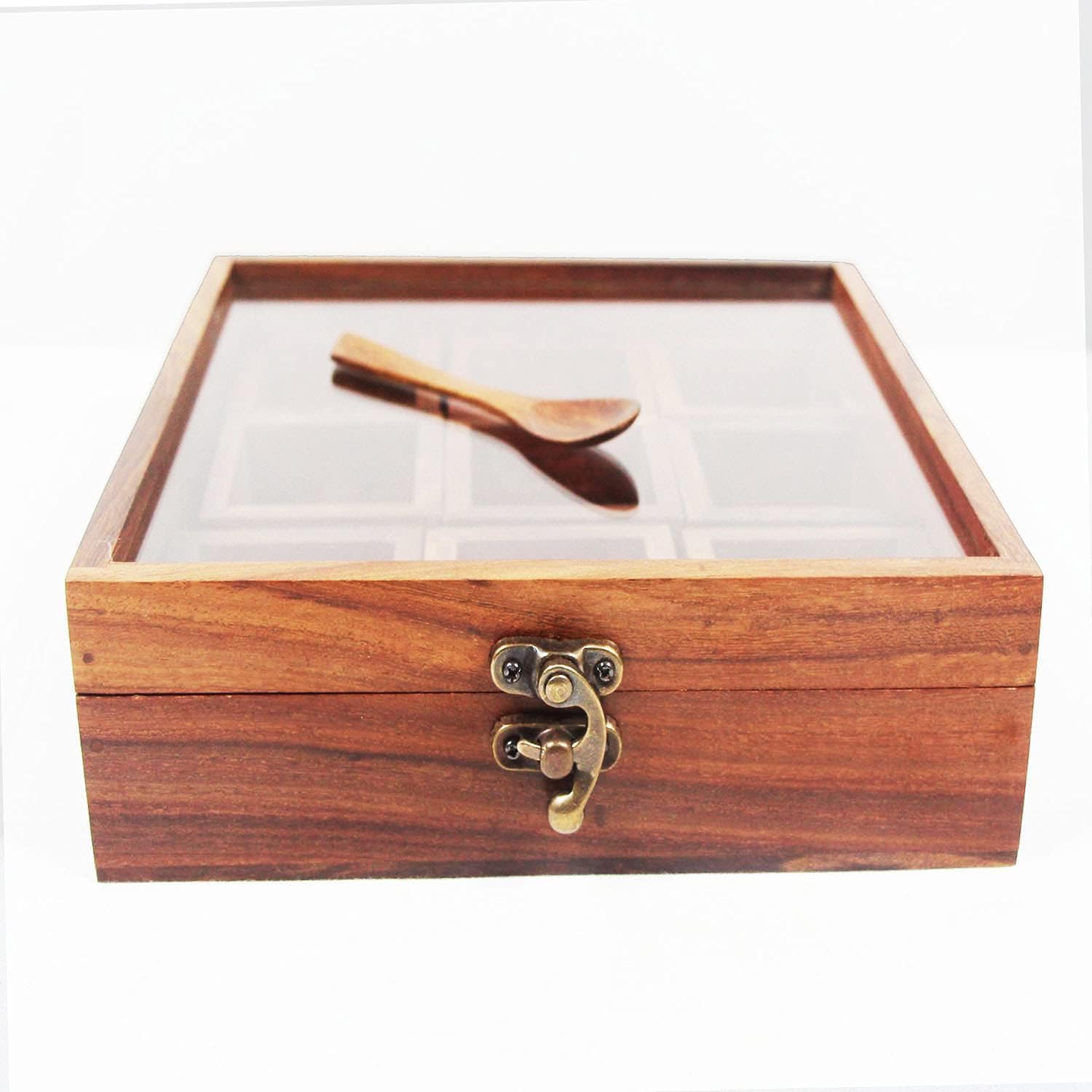 Bring elegance and tradition into your kitchen with this handcrafted wooden masala box, designed to keep your everyday spices fresh, organized, and within easy reach. Made from premium quality wood, this spice box features 9 spacious compartments and a matching wooden spoon, perfect for storing essential Indian spices like turmeric, cumin, coriander, chili powder, pepper, and more.