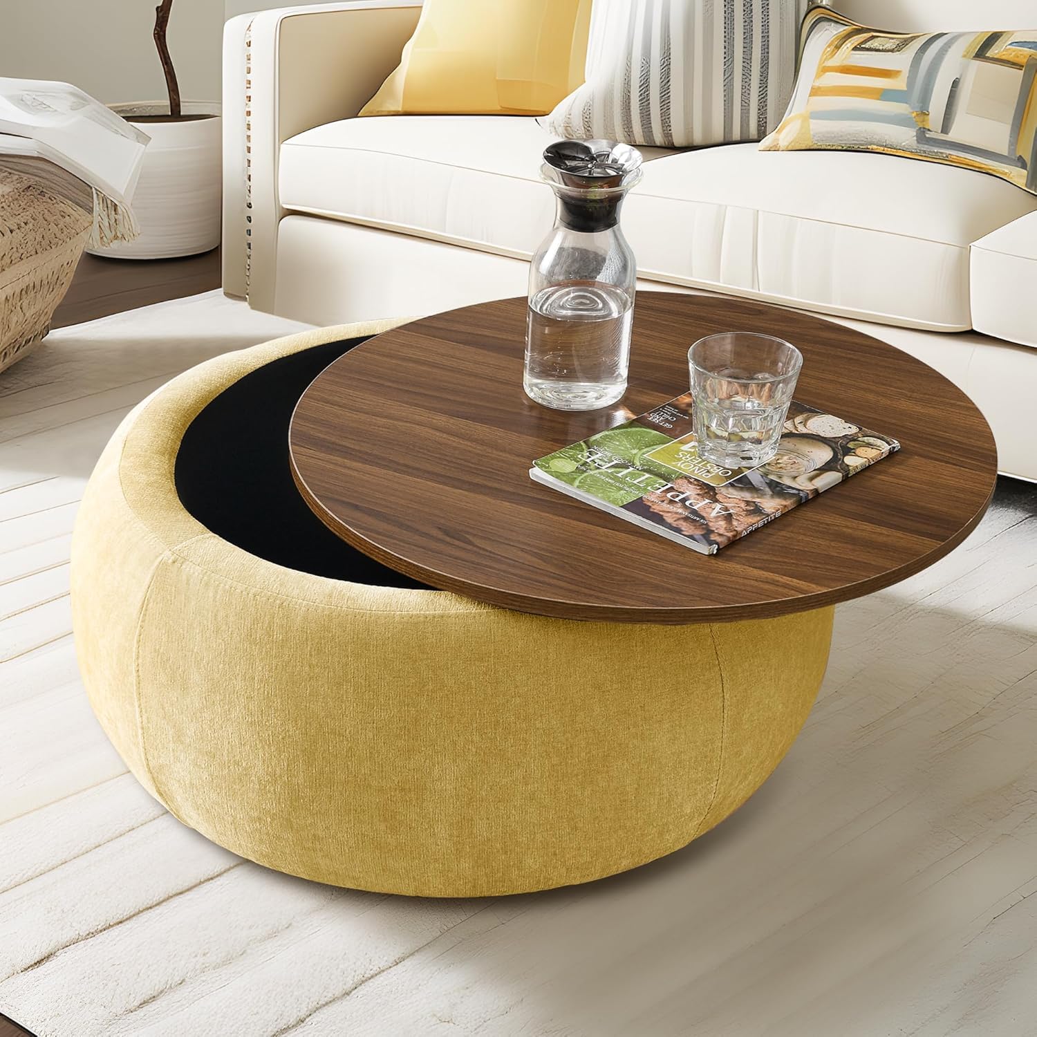 Upgrade your living room with this Modern Round Storage Coffee Table, designed with style, comfort, and practicality in mind. This multifunctional piece features a soft yellow upholstered ottoman base paired with a smooth walnut-finish wooden top, giving your space a warm and contemporary look.