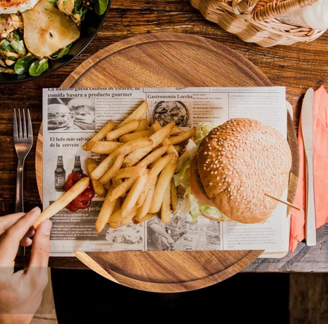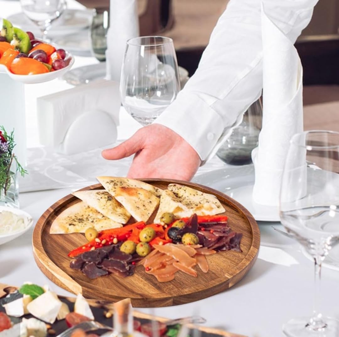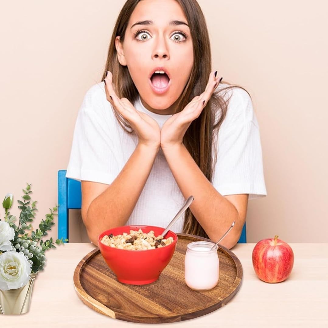Add warmth and elegance to your table with this beautifully crafted round acacia wood serving tray. Designed with a smooth raised rim and rich natural wood grain, this tray is perfect for serving snacks, tea, coffee, desserts, or using as a stylish centerpiece for your dining or coffee table.